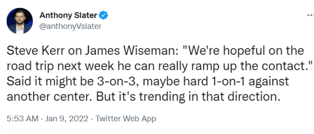科尔还在采访中谈到了怀斯曼。“我们希望在下周的客场之旅时他能提升到对抗训练。”可能是3对3,也可能是与另一个中锋的1对1。看来,汤普森即将复出,怀斯曼离回归也不远了。
