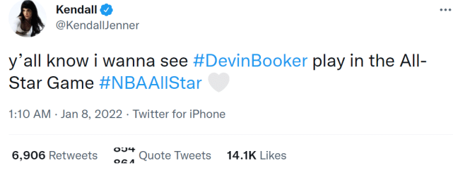 詹娜在IG社媒上晒出了自己的全明星投票截图,上面只有布克一个人,她还在推特社媒上写道:“你们知道的,我想看德文-布克打全明星赛。”詹娜在IG上有2.1亿粉丝,在推特上有3180万粉丝,累计超过2.4亿粉丝。IG上拥有2.1亿粉丝是什么概念?湖人球星詹姆斯的IG粉丝是1亿,詹娜是他的两倍还多。