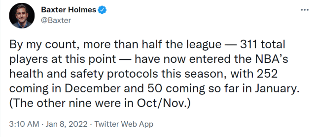 ESPN名记Baxter Holmes在社媒上写道:“据我统计,,超过联盟球员的半数,其中252名球员在12月触发协议,50名球员在1月触发协议,而另外9名球员在10月/11月触发协议。