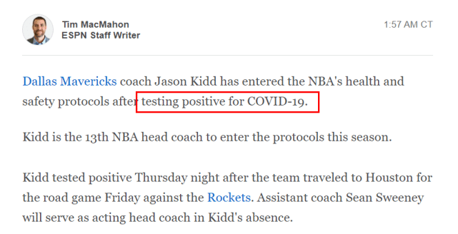 基德确诊阳性!第13位主教练中招,NBA已有311名球员触发协议