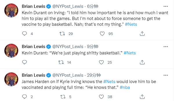 对于欧文是否接种疫苗的话题,杜兰特表示:我告诉他他(对我们)有多重要,我多么希望他能参加所有比赛;但我不会强迫他接种疫苗去打篮球,不,那不是我的事。