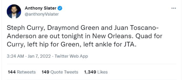 33岁的库里本赛季健康状况良好,这只是他缺席的第3场比赛。对独行侠一战,库里在比赛中股四头肌挫伤,赛后,谈到能否出战对鹈鹕的比赛,库里表示以目前的状况来看,并不感到乐观。最终,也如他本人所料,库里缺席了这场比赛。2019-20赛季,库里因伤只打了5场比赛,2020-21赛季,他打了72场中的63场。