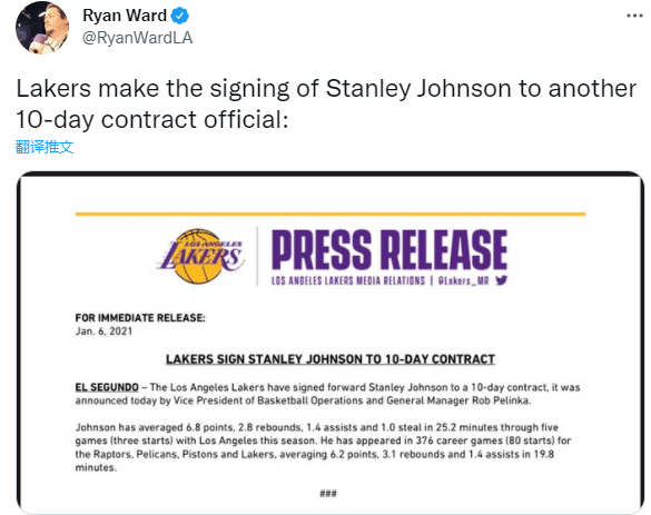 25岁斯坦利-约翰逊为湖人提供了活力和防守的韧性,这是湖人重新用十天合同签下他的最大原因;此前曾有记者报道,若约翰逊依旧表现很好,他有望获得一份签约到赛季结束的合同。