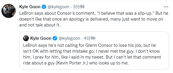 老詹还表示我并不是要他丢掉工作,我只是不同意他的错误言论:我从未见过那个人,我不认识他,我为他祈祷,就像我在推文中所说的那样。但我不能让这种评论围绕着一个尊敬我的人(小凯文-波特)。
