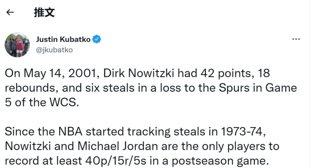 为了表示致敬,数据专家Justin Kubatko连续更推晒出了司机生涯各种传奇数据。在2001年5月14日,诺维茨基在季后赛对阵马刺的比赛中砍下42分18板6抢断,自从73-74赛季引入抢断数据以来,乔丹和司机是历史上仅有的2名能在季后赛单场送出至少40分15板5抢断的球员。