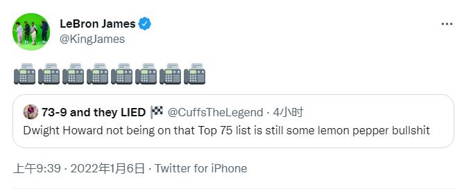 一名NBA的分析师更新社交媒体写道:“德怀特-霍华德没能进入NBA历史前75大真是太扯了。”在前一天的比赛中,霍华德替补登场得到14分14板3助攻2抢断的亮眼数据。他也向沃格尔证明,只要自己得到机会,他的油箱里依然还有足够燃料。詹姆斯转发了这则动态,并附上了几个传真机的表情,意思就是这话说得很对,要广而告之。