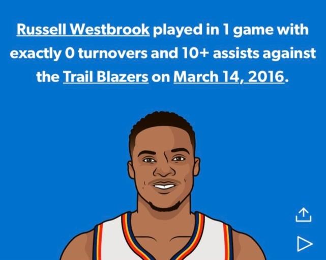 数据显示,北京时间2016年3月15日,对开拓者一战是威少生涯至今唯一一次助攻上双却没有失误的比赛。那场比赛,威少送出16次助攻,却没有失误,相当罕见。