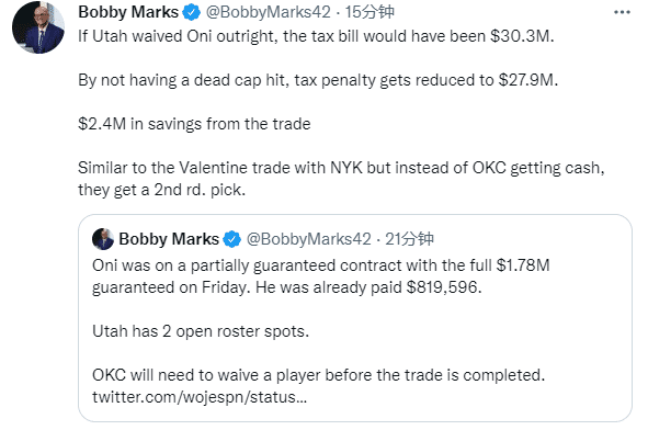 爵士2换0交易的目的在于省钱和腾出阵容名额,据薪资专家Bobby Marks后续报道,通过这笔交易,爵士可以省下240万美元,比裁掉奥尼更省钱;目前爵士大名单上有两个签人名额;雷霆没有获得现金,而是获得一个二轮选秀权。