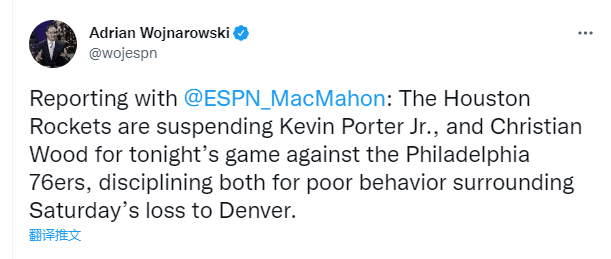针对小波特和伍德的不当行为,火箭对他们进行了禁赛处罚。