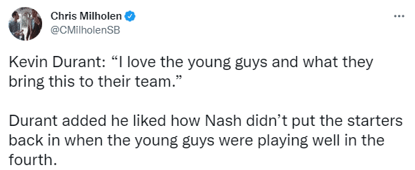 赛后,当篮网看到赢球希望时,纳什仍旧使用替补阵容却不用杜兰特和哈登被吐槽,不过杜兰特力挺纳什,赛后谈到纳什的决定,杜兰特表示:我爱这些年轻人,也爱他们为球队带来的一切。很高兴看到纳什没在这群年轻人打得很出色时再次换上首发。