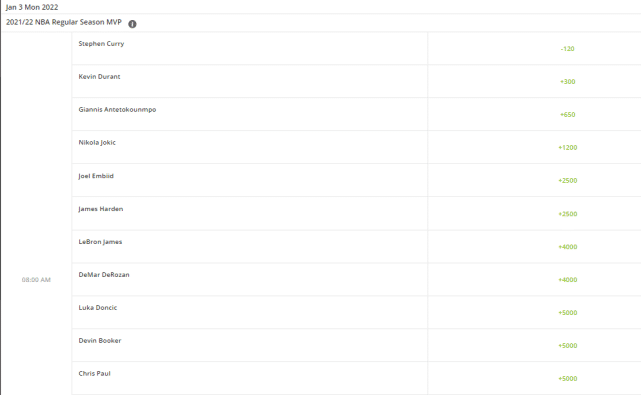 以下是最新MVP赔率的前十排位:库里(-120)、杜兰特(+300)、字母哥(+650)、约基奇(+1200)、恩比德(+2500)、哈登(+2500)、詹姆斯(+4000)、德罗赞(+4000)、东契奇(+5000)、布克(+5000)、保罗(+5000)。