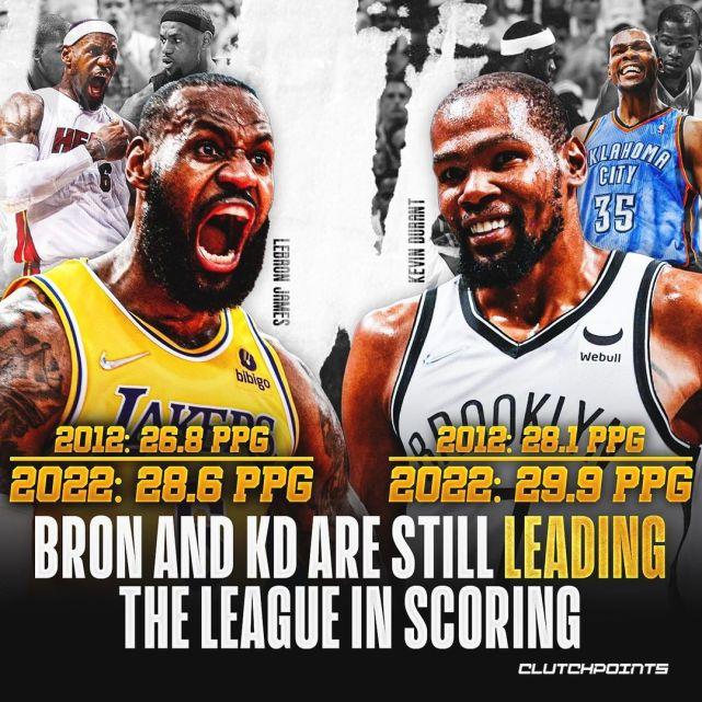 第一重现,是时隔10年,詹姆斯和杜兰特依然在得分榜处于领先位置。2012-13赛季,28岁的詹姆斯场均26.8分,24岁的杜兰特场均28.1分,两人都在联盟得分榜上排名靠前。2021-22赛季,37岁的詹姆斯场均28.6分,33岁的杜兰特场均29.9分,仍是得分榜靠前的球星。clutchpoints的点评是“詹姆斯和杜兰特依然统治这个联盟。”