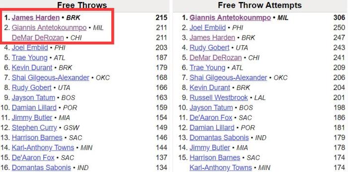目前,哈登本赛季的罚球数据是247罚215中,罚球命中率高达87%。其中,命中215个罚球,已经超越了字母哥和德罗赞的211个,排名NBA第一位!事实上,哈登在罚球出手次数上落后于字母哥的306次和恩比德的250次,但哈登的罚球命中率要高得多,字母哥和大帝只能拜服。
