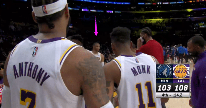 威少关键时刻出现致命发球五秒违例,直接把球权白送给森林狼;对此,沃格尔摘掉口罩并且露出无奈的笑容,一脸苦笑;湖人众将走回替补席,詹姆斯走到场边与沃格尔交流了一下,站在附近的威少一脸沮丧。
