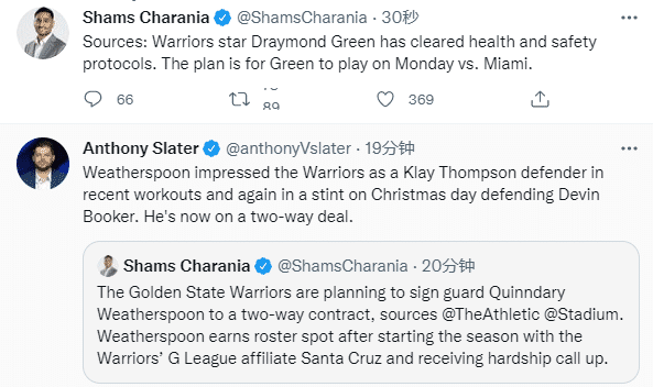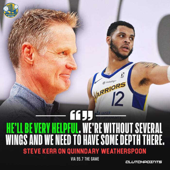 在过去两个赛季中,25岁的奎因达里-韦瑟斯庞为圣安东尼奥马刺队共打了31场比赛,场均上场6.4分钟得到1.9分;对于勇士调整双向合同球员,勇士记者Anthony Slater表示奎因达里-韦瑟斯庞在训练中给球队留下了深刻的印象,年终大战防守布克也有出色表现。