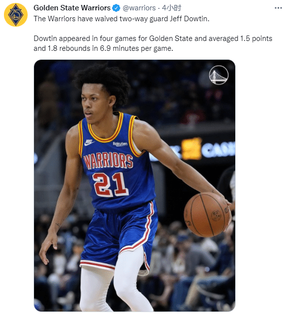 赛前开始前,杰夫-道丁和勇士签下双向合同,夏联为魔术效力,如今25岁的杰夫-道丁已经被裁,本赛季至今,他代表勇士出战4场常规赛,场均上场7分钟可以得到1.5分1.8篮板0.8助攻。
