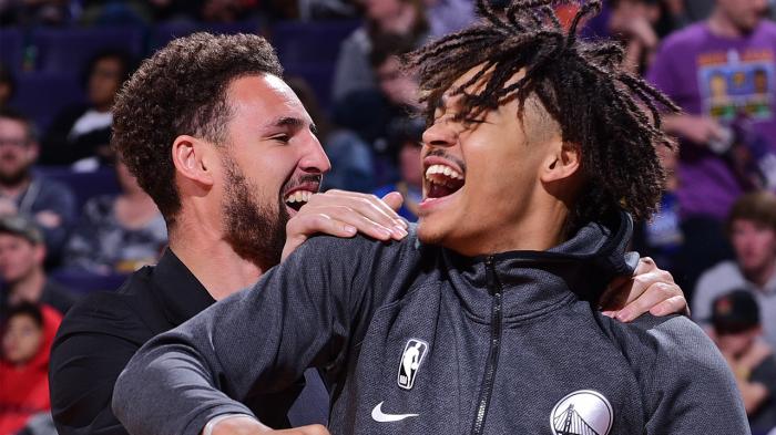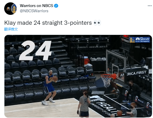 31岁汤普森的手感柔和且稳准狠,站在底角加练三分球,身穿勇士训练服并且佩戴白色发带,连续命中24记三分球,第25次出手打铁不中后,汤普森有点小不满,之后又投进一记三分。