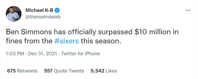 来源:24直播网01-01 15:5424直播网01月01日讯 ,新一年的第一天,据美国NBA记者Michael K-B报道,76人对本-西蒙斯的罚款已经超过1000万美元。