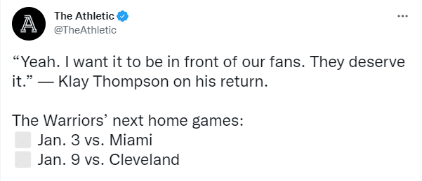 勇士记者Anthony Slater报道,汤普森表示他感觉自己费城接近复出,但目前透露具体的复出时间表,他说:两年来的第一次,我想要在勇士球迷面前复出,他们应得的。