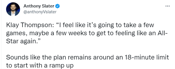 汤普森还表示:我感觉复出后需要几场比赛,也许需要几周的时间才能重新找回全明星时期的状态;对此Anthony Slater表示,看来汤普森计划复出时把上场时间限制在18分钟,逐渐增加上场时间。