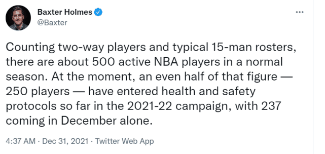 来源:24直播网12-31 15:3624直播网12月31日讯 ,据ESPN记者Baxter Holmes报道,截至今日,NBA已有250名球员触发健康安全协议,而正常赛季算上双向球员,NBA大概有500名球员。换言之,本赛季已经有一半球员有过触发协议的经历。仅12月这一个月份,就有237名球员触发协议。