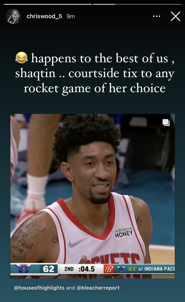 伍德在赛后采访中曾说:“我希望她没事,如果他需要一张比赛的球票,我可以送给她。”赛后,伍德在个人社媒上转发了视频,写道:“(笑哭表情)可能是我们最好的五大囧了……她可以任选一场火箭比赛,我给她场边的球票。”