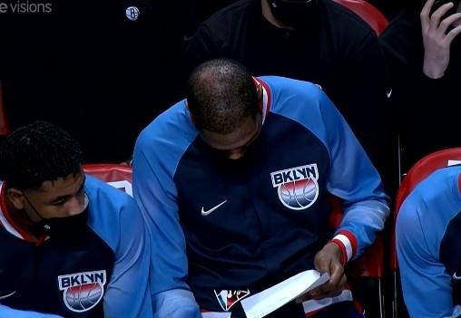 第二节,杜兰特坐在替补席休息6分钟,期间杜兰特认真研究数据统计表;上场后,杜兰特中投得分,单节3投2中贡献6分,哈登连突带罚不断得分,篮网单节23-16追到落后1分;杜兰特半场13分,哈登也贡献13分还有8篮板5助攻。