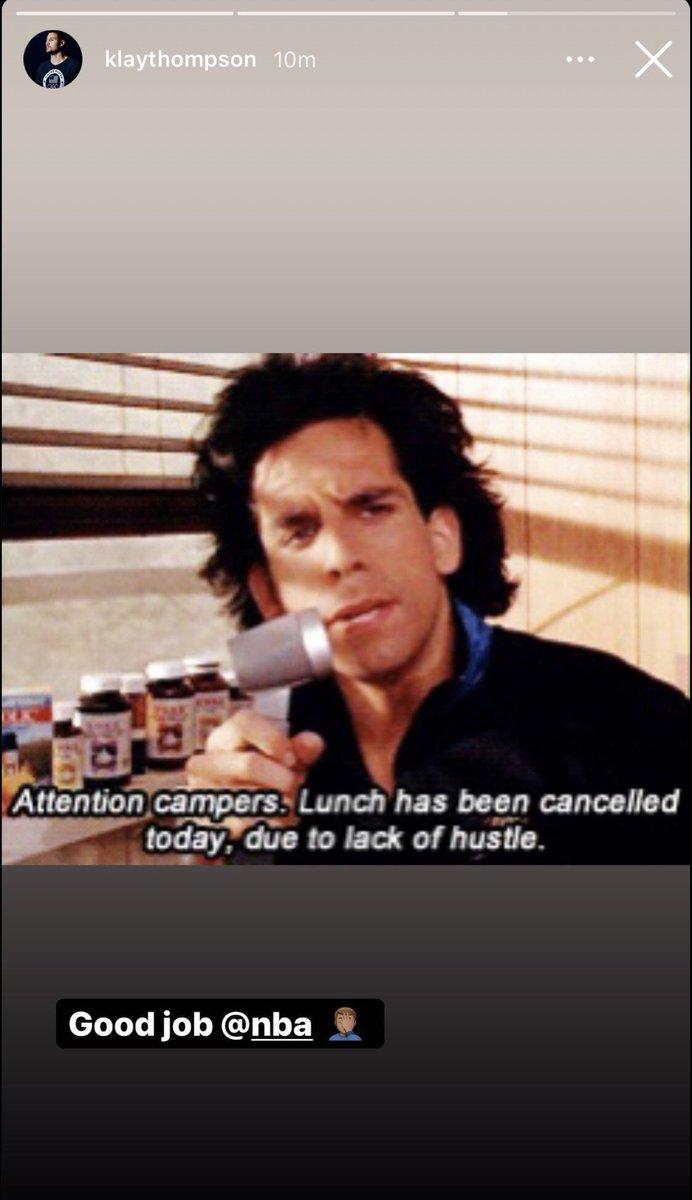 对于勇士比赛被延期,克莱-汤普森晒图并且写道:NBA干得好(图片中写着大家请注意,今天的午餐取消了)。