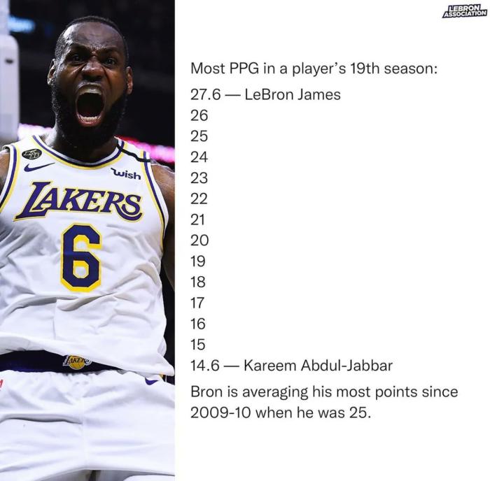 37岁职业生涯第19个赛季,詹姆斯仍旧打出不可思议的表现,本赛季场均27.6分创个人生涯近11年新高,如此得分也是NBA历史上第19年场均最高得分,十几年过去了,三旬老汉仍旧像个新秀似的。