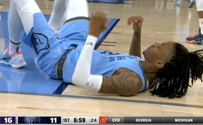同时莫兰特还隔扣过骑士中锋乐福,他想要上演死亡隔扣,无奈的是乐福的经验更加丰富,他早就提前站好了位置,被吹进攻犯规。