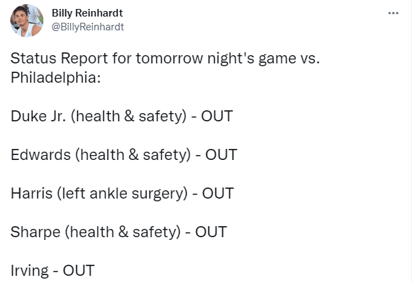 下一场对阵费城,杜兰特和阿德将复出,托马斯也已经解除隔离并将复出,不过杜克、爱德华兹和夏普仍旧被隔离,乔-哈里斯和欧文都不会出战,欧文最快1月6日复出。
