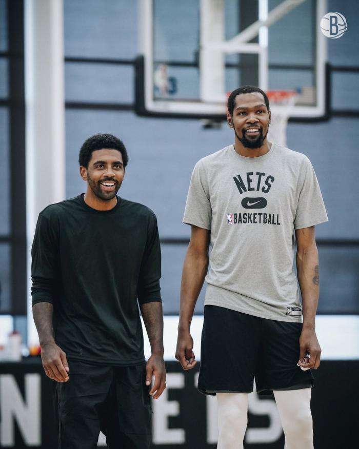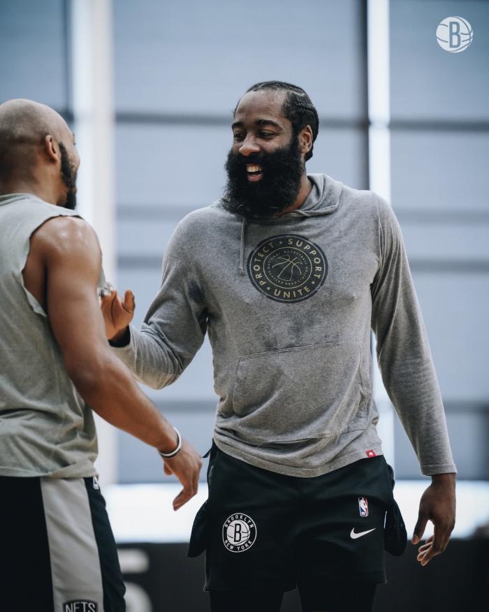 篮网三巨头正式合练!哈登练出汗咧嘴大笑,杜兰特欧文同框满脸笑容