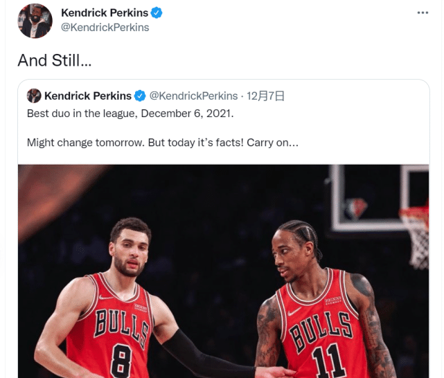 公牛这三大球星无疑是被低估的三巨头,拉文和武切维奇上赛季就入选了全明星,而德罗赞本赛季的发挥显然是巨星级别。值得一提的是,NBA评论员帕金斯在本月7号的时候就表示拉文和德罗赞是本赛季表现最强的双人组,在目睹今天这场比赛后,帕金斯再次发推:他们还是第一组合!