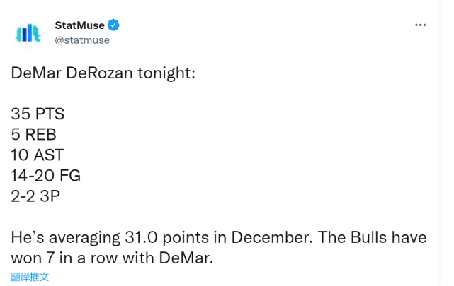 此役,公牛3大球星均有亮眼发挥,德罗赞首节就砍下15分,全场则是20中14高效送出35分5板10助攻的全面数据,助攻创个人赛季新高!70%命中率砍下35分10助,德罗赞也是公牛队史自乔丹后首人。据美媒statmuse统计,12月至今,德罗赞出战7场比赛场均可以砍下31分,而公牛这7场全部获胜!