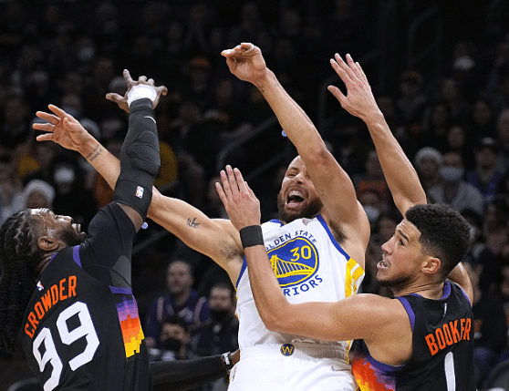 库里的外线投篮简直可以让人叹为观止。外线飘逸灵动的运球找节奏,稍不留神就是一个logo三分、压哨三分、半场三分。如果你不选择半场包夹他,库里的外线火力会让比赛很快来到垃圾时间。所以只要库里持球,对手就会使用身体接触,对库里进行压迫性防守。