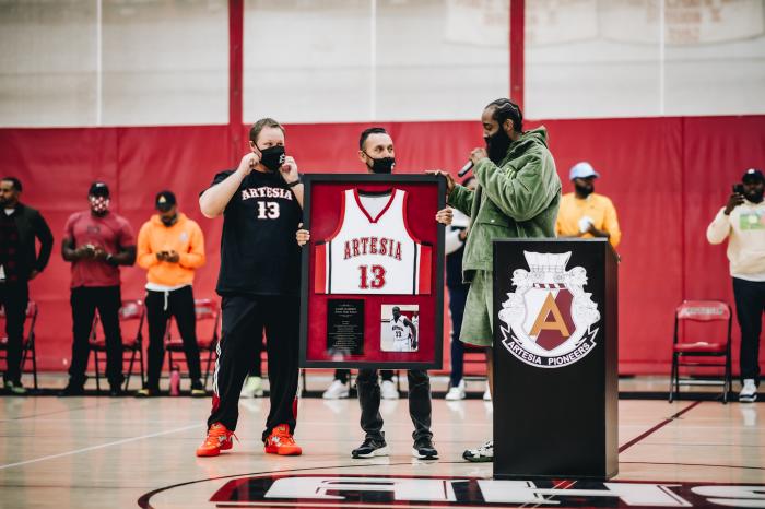 在退役仪式上,在场所有人都为哈登鼓掌欢呼,他的高中队友都来了,哈登又到更衣室回顾往事,他昔日的更衣柜上写着“哈登13”字样;哈登表示:高中母校养育了我,让我彻底爱上了篮球。