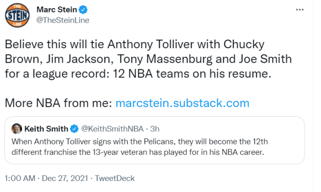 来源:24直播网12-27 15:0724直播网12月27日讯 ,36岁老将安东尼-托利弗将和鹈鹕签下一份10天合同,2021-22赛季将是他的生涯第14季。记者Keith Smith表示,鹈鹕是托利弗效力的第12支球队,而记者Marc Stein表补充道:“生涯效力12支不同的球队,意味着托利弗追平了联盟纪录,此前,查基-布朗、吉姆-杰克逊、托尼-马森伯格、伊斯梅尔-史密斯和乔-史密斯都曾做到过。”