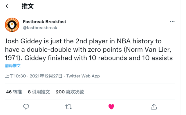 据美媒Fastbreak Breakfast统计,基迪就此成为NBA历史上第二位单场0分情况下仍然拿到两双的球员,历史第一位是1971年的诺姆范里尔曾打出0分13助攻11篮板。0分10板10助攻这数据确实奇葩,很多球迷第一时间想到了格林和隆多,因为这两大球星拿三双最大的阻碍都是得分。