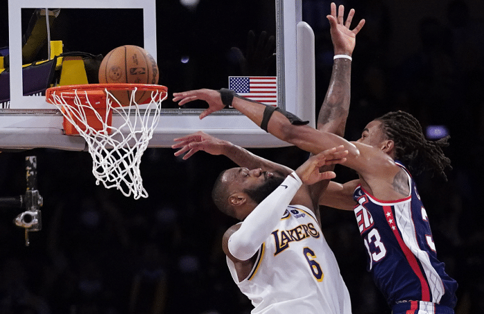詹皇遭隔扣后续!美媒晒现场照:老詹哈登对视,篮网新星庆祝表情太狠