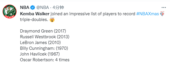 第三、沃克是NBA历史上第7位在年终大战拿到三双的球员,比肩詹姆斯、威少、格林、比利-坎宁安、约翰-哈夫利切克和大O罗伯特森(4次)成历史第7人,这也是NBA年终大战历史上的第10次三双。