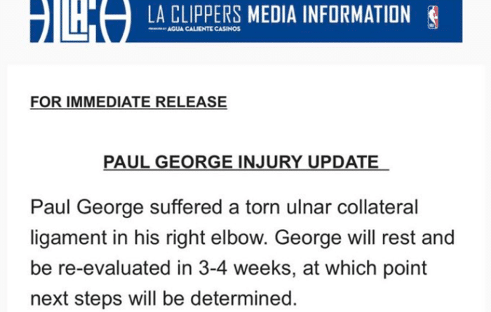 快船官宣!乔治右肘韧带撕裂,医学专家:最严重至少伤停一年