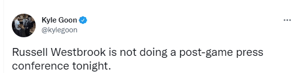 赛后哈登和威少都冲上推特热搜,哈登30+三双被盛赞为赢球大功臣,威少却因球迷热议“交易威少”而冲上热搜;据湖人记者KyleGoon报道,威少不会接受采访。