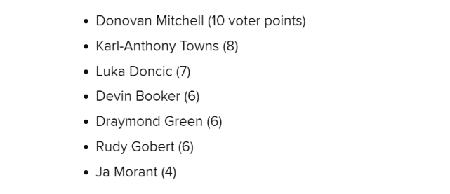根据投票计分,西部全明星替补是米切尔(10分,注:得分和保罗相同,但太阳成绩更优)、唐斯(8分)、东契奇(7分)、布克(6分)、德雷蒙德-格林(6分)、戈贝尔(6分)和莫兰特(4分)。