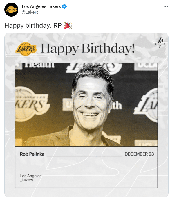 来源:24直播网12-24 19:4624直播网12月24日讯 ,湖人篮球运营副总裁罗伯-佩林卡迎来52岁生日,湖人官方发推为其庆生,晒照并且发推写道:生日快乐!罗伯-佩林卡!
