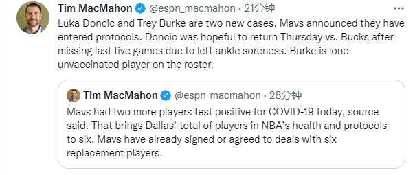 来源:24直播网12-23 14:0624直播网12月23日讯,NBA又有一名球星确诊新冠,据名记Tim MacMahon报道,独行侠队东契奇和特雷-伯克的新冠检测呈阳性,确诊感染新冠,因此独行侠队被隔离人数增至6人。