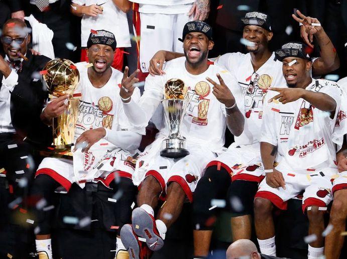 詹姆斯+韦德+波什,热火三巨头在一起打了4个赛季,连续四年统治东部杀进总决赛,并且四年两次夺得总冠军,詹姆斯蝉联FMVP。