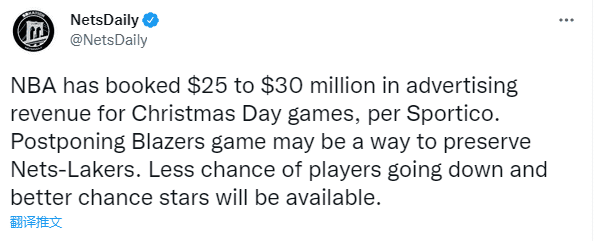 来源:24直播网12-23 13:5324直播网12月23日讯,据美媒NetsDaily的报道,本赛季的圣诞大战,NBA至少可以获得2500-3000万美元的广告收入,美媒还表示联盟延期篮网和开拓者的比赛很可能是因为篮网接下来要和湖人打年终大战,这样的话明星球员上场的机会更大。
