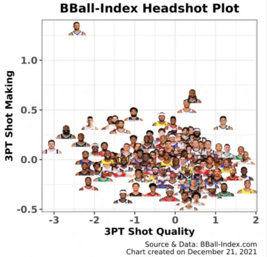 来源:24直播网12-22 11:4324直播网12月22日讯 近日《BBall Index》汇总了下本赛季NBA球员们的三分球能力榜,统计的是三分球出手机会和三分球命中能力,制作成图表进行汇总。其中横轴表示的是出手机会的好坏,越靠左机会越不好。纵轴表示命中能力的好坏,越靠下能力越差。