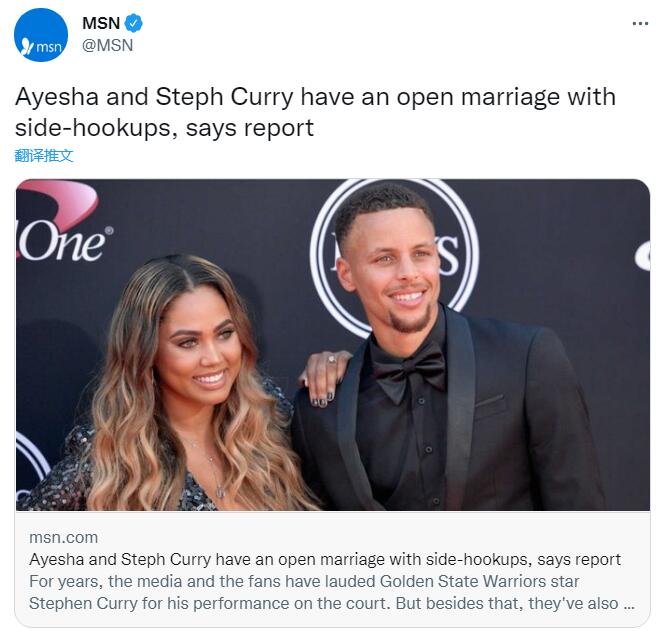 来源:24直播网12-22 11:2524直播网12月22日讯 ,来自微软旗下的媒体爆出令人感到不可思议的消息。来自著名八卦页面Deuxmoi上的匿名消息显示:一直以来以好男人示人的勇士巨星史蒂夫·库里,和他的妻子阿耶莎在保持恩爱婚姻的前提下,各自婚姻中有“旁观者”的存在。这一消息目前并未得到两人证实,但已经冲上美国热搜。