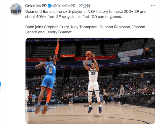今天这场比赛是贝恩常规赛生涯第100场比赛,在这场比赛之前他已经命中198记三分,而对阵雷霆第一节,贝恩就迅速命中2记外线,生涯三分命中数突破了200个。据灰熊官方统计,贝恩就此成为队史在生涯前100场命中三分数最多的球员!